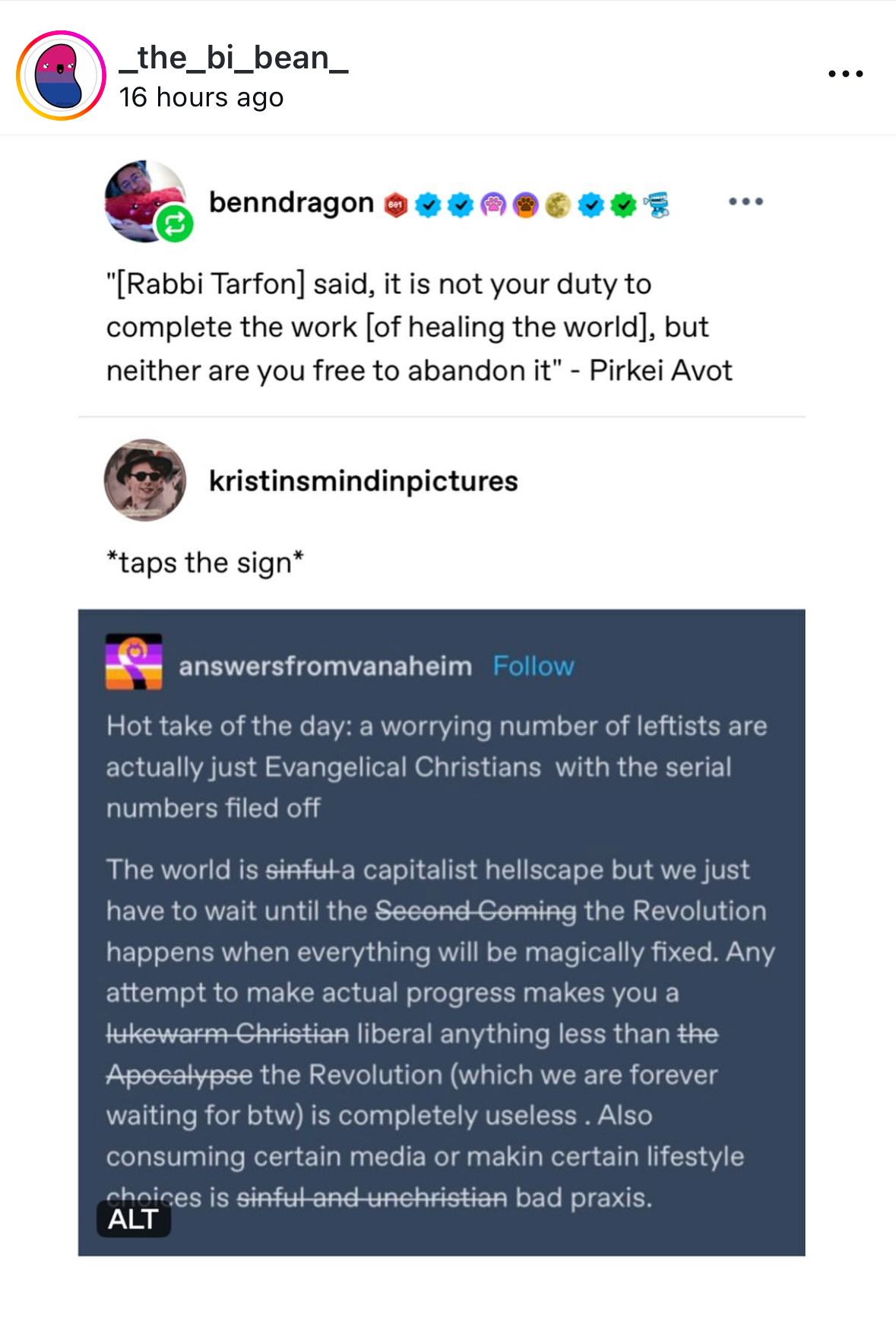 But the Revolutionary and the Christian both become my friends when they share this commonality: they are helping people right now. They are not testing the purity of someone’s beliefs, or dismissing their work because it doesn’t match an exact philosophy. They are not waiting for a second coming.